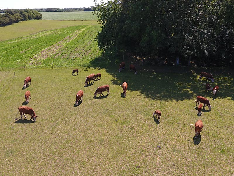 Vi er certificeret økologisk landbrug og er så godt som selvforsynende. Vi bruger ingen sprøjtemidler og pesticider og bliver løbende kontrolleret for, om vi overholder betingelserne for økologisk landbrug i Danmark.